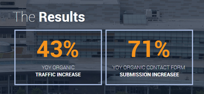 自从和我们合作以来,雷诺看到了43%增加有机交通和往返71%增加有机联系表单提交——人们在有机搜索结果中查看他们的站点后联系雷诺兹。