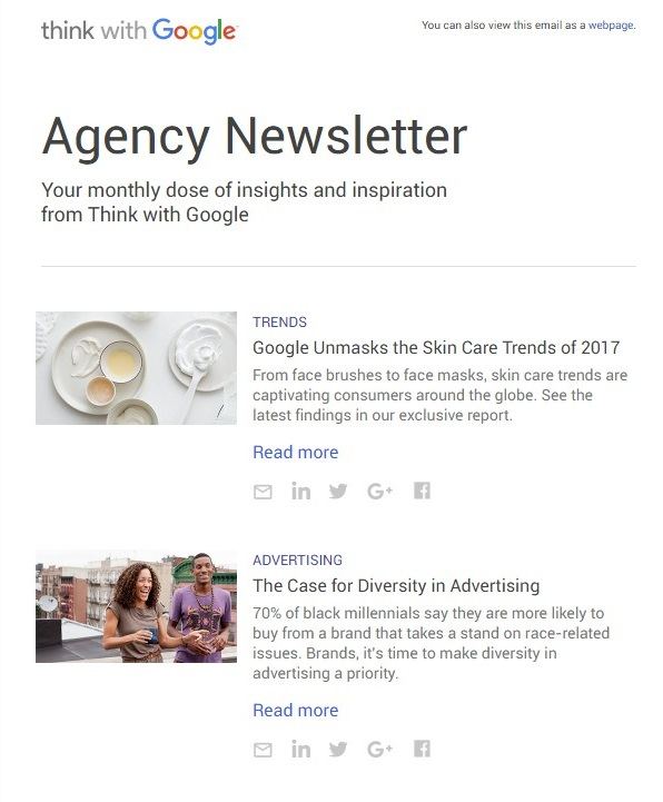 的用谷歌思考《时事通讯》在合并空白方面做得很好,可以通过电子邮件引导读者,并在特色故事之间建立清晰的间隔。