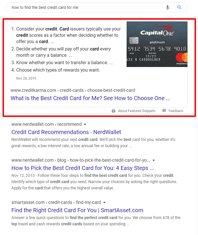 当你搜索“如何为我找到最好的信用卡”,他们的有机列表出现在特色片段。