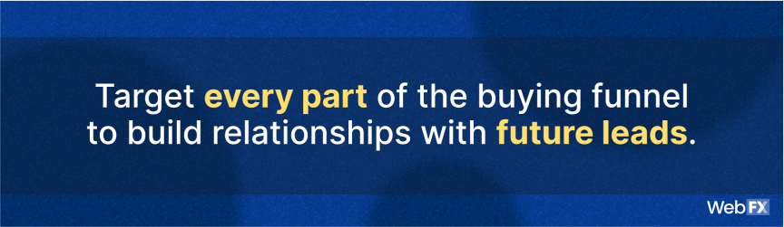 这就是为什么您的业务想要针对购买漏斗的每个部分。通过全面,全面的全面的购买漏斗方法,您的公司可以与未来的领导建立关系,然后在他们准备购买时签署它们。