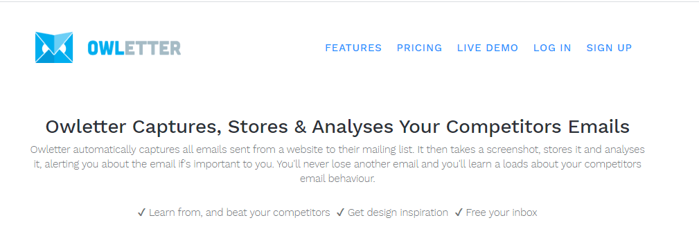 小猫头鹰是另一个竞争对手分析工具,允许您捕获和分析竞争对手的电子邮件。这个工具截屏重要的电子邮件,并通知你的公司,当你的竞争对手发送有价值的电子邮件。这是一个了解你的竞争对手和他们的电子邮件策略的好工具。