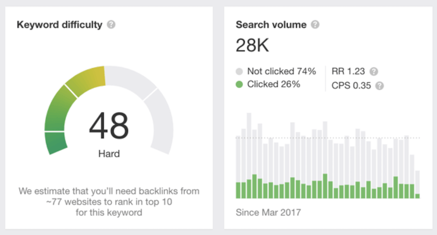 下面是来自Ahrefs的一篇关于关键词“水肺潜水”的报道。这个短尾关键词的关键字难度为48,被认为很难在前10个搜索结果中排名。它的搜索量是28000。