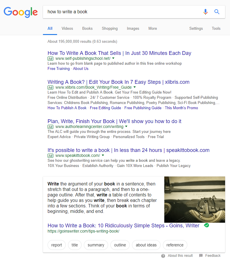 如果你在谷歌中输入搜索,你很有可能会看到弹出一个弹出框,里面有你的答案。它们有几个不同的名称,如回答框和其他。然而,谷歌将这些称为精选片段,所以这就是我们将它们引用的。这是特色段的示例: