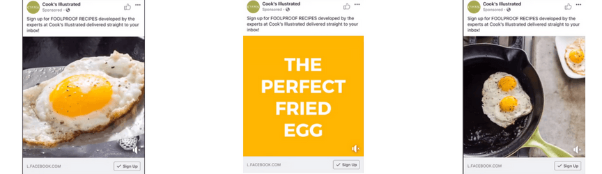 这家测试和制作厨房产品内容的媒体公司在他们的广告中加入了文本。在没有声音的情况下,用户知道该公司提供的是制作完美煎蛋的万无一失的配方——他们所要做的就是注册。