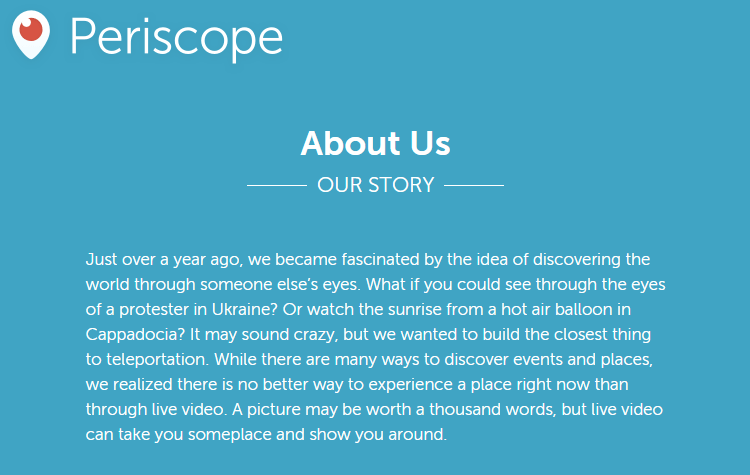 视讯流应用Periscope问世“才一年多”,所以他们的“关于我们”页面解释为什么他们的应用对那些可能从未听说过它的人有用是很重要的: