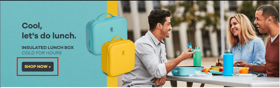 假设Hydro Pack将他们的产品托管在一个不同的网站上。在页面的前面,他们有一个隔热午餐盒的图形,后面是一个CTA按钮,写着“现在购物”。如果他们把产品放在一个单独的网站上,他们可以通过CTA链接到他们的网站,并引导用户到他们的商店。